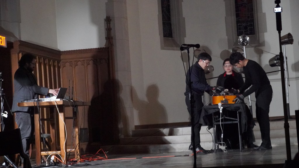 Biometric Composition for Ensemble (2026) With this piece, my third with Tacet(i), I find myself building on previous themes in a fashion that leaves me wondering if this is a separate composition or an iteration of a larger, collaborative work. As with previous installations, the primary objectives of this piece concern notions of autonomy, identity, and interactivity with regard to group, external and technological dynamics. Returning once again is a decentralized, prompt-based score derived from previous works as well as new additions serving as an “expansion pack” inspired by the tabletop card games of my youth. Also returning is brainwave-informed machine learning software that reconstructs sampled motifs and gestures in accordance with the performers’ reactions to the score, the subsequent reconstructed recordings and themselves. New for this iteration will be sensor-embedded, wearable interfaces developed with Paulina Velazquez Solis and designed to inhibit performance, introducing a quantifiable element of struggle into the piece. With this addition, it is our intention to explore the musical potential of wearable technology, as well as a collective, whole-body cybernetic approach to composition – while adhering to an egalitarian structure in which the performers, composers, and technological elements all contribute equally to the outcome of the piece.