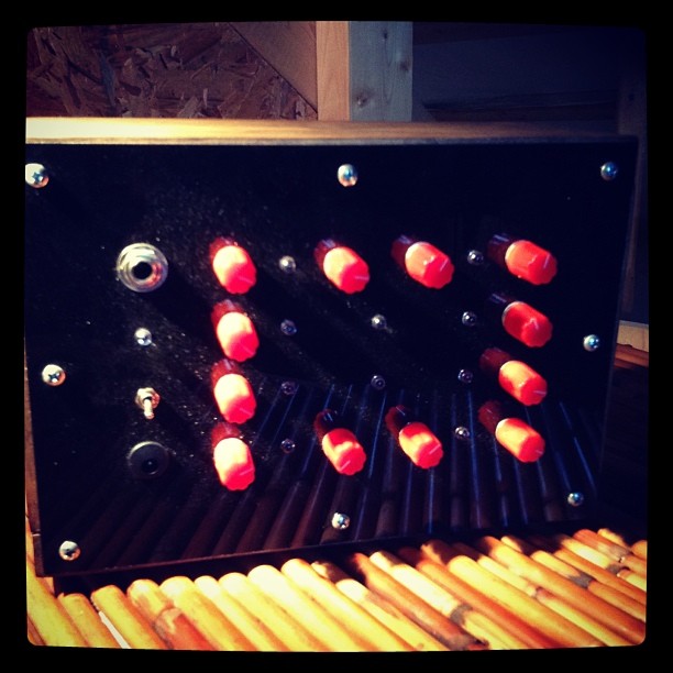 Update, 2017: Sometime around 2014, I added a crude CV input to the box via 1/8″ jack that would allow it to be powered on and off via clock signal – something I did to a lot of the builds from this era until I ended up plunging down the rabbit hole otherwise known as Eurorack. Not to say that the two are mutually exclusive. At the moment, this particular box lives in Oberlin, Ohio, in the care of the Oberlin Conservatory’s TIMARA department.