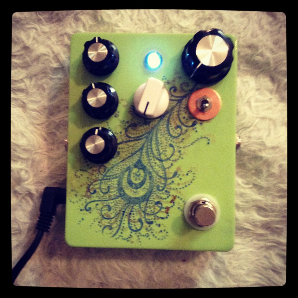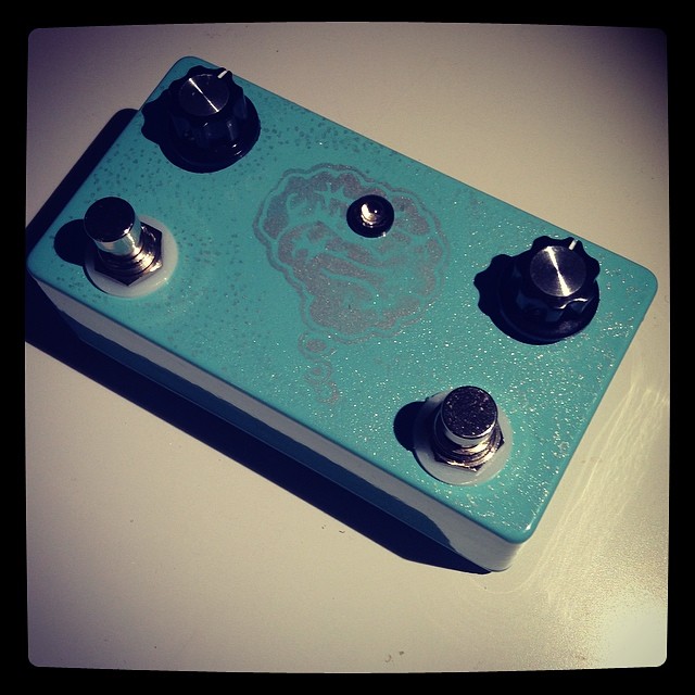 Another variation on our oft-repeated 4-transistor fuzz build, this time in sea foam and pink. This one lives in Chicago with the band Wilco.