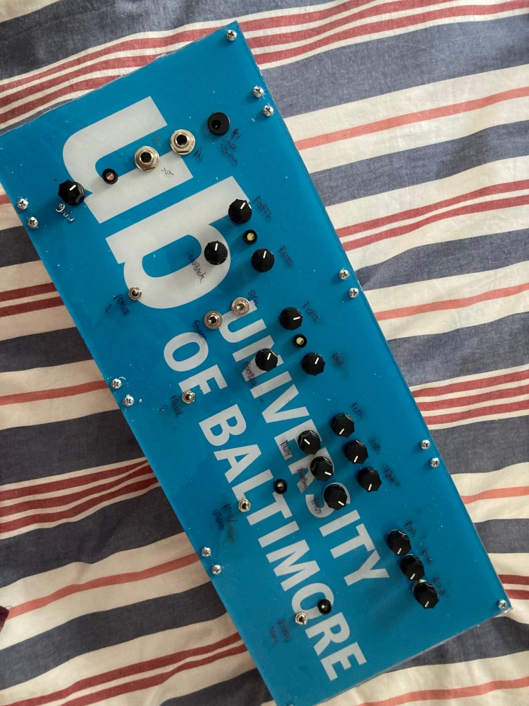 A multi-effect industrial boat made out of a podium sign from my old job featuring a boost, 2 phasers, a vibrato and a reverb. Liz and Tim have this one in Baltimore.