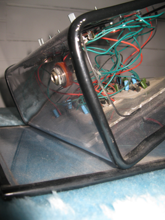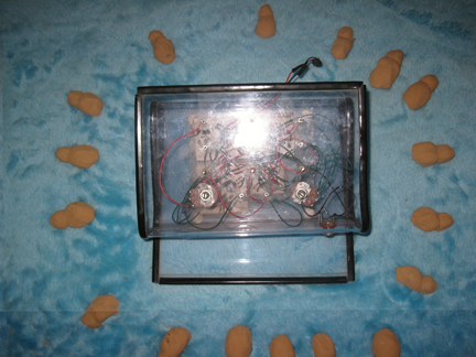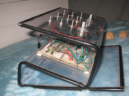 While in Costa Rica and still strapped for cash, I cobbled together what circuits I could and set out to make her a synth for X-mas, which I did, completing three portions of Pete’s Rollz-5 drum machine (two oscillators and one filter) and housing it in a unique interface. The case on this one is unique in the fact that it is an open design formed by clear acrylic, heated with a heat gun and bent accordingly into an aesthetic, if not ergonomic design designed by Paulina’s brother Luis, who happens to be an industrial designer. The black trim on the outside of the case is actually pieces of automobile window gasket, offering a streamlined edge to a pretty futuristic-looking contraption.