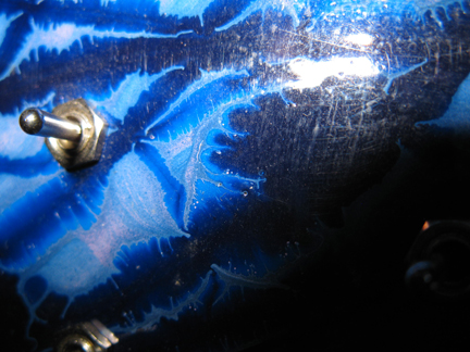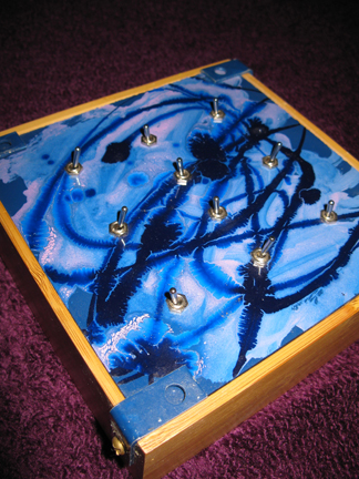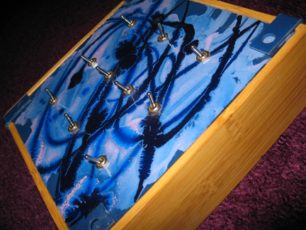 Built in May 2009 as a preliminary experiment with presets, as well as new enclosure construction techniques. Most notable about this build is that it’s the first box that utilizes bamboo in it’s construction, as well as precision cut plexiglass, leading to a much more professional appearance upon completion that simply slathering some paint on a plastic project box and calling it fancy. Also of note is that this was my first experiment that used switches as part of the design, hoping to veer away from the circuit-bending aspects of my previous builds in favor of predictability, or at least the ability to recall certain sounds when the moment called for it. Obtaining the switches was a little difficult, however. I was still somewhat unfamiliar with the secret, coded language needed to understand the various electronic supply catalogues, and, afraid of accidentally ordering the wrong parts, decided to search out what I needed from the local Radio Shacks, who, on a good day possibly stock maybe two of each item. Considering I needed more than a dozen SPST switches for this build, I think I might’ve cleaned out the entire supply for all of San Francisco while creating this box – at a price comparable to about a hundred or so similar switches had I ordered them online. A quick word of advise for anyone interested in taking a trip down this particular DIY rabbit hole – to best maximize your capital, avoid Radio Shack like the plague. They may occasionally have what you need in a pinch, but their cost of necessity is a high one, to say the least. Unfortunately, the circuit used to accommodate this idea might not have been the best choice – creating sounds that could be best describes as various choirs of mosquitos but eh, it’s a start. One day I hope to return to concepts initially explored with particular build, but at the moment it earns it keep exclusively as a nice conversation piece on a shelf.
