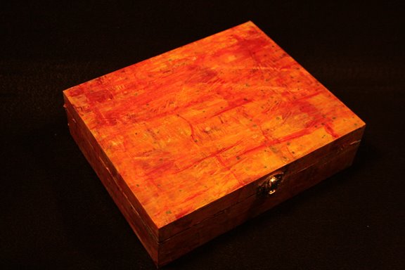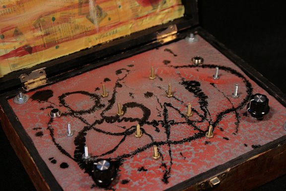 I built Number 6 in Upstate New York over the course of the holidays in 2008, almost a year to the day since the completion of Number 1, as a variation on it’s direct predecessor, which I finished a few months prior. As with Number 5, Ciat-Lonbarde’s “Old Mr. Grassi” provides the core of this instrument, with the added bonus of two filters hooked to each of the instrument’s respective outputs. Of note on this particular model is the casing, which heralded a return to collaged wooden boxes with hinged lids for the sake of the traveling, etc. – a technique I still employ for “special” boxes, as well as the occasional gift to friends when the twinge of sentimentality doth require. However, unlike Number 3, which took months to collage, due to the fact that the entire lid of the box is composed of collaged purple petals from gardening magazines, Number 6’s paper was originally painted newsprint, whose design was provided by Paulina Velazquez-Solis.