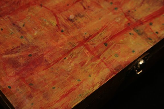 For the faceplate, plexiglass was used once again, but with automotive spray paint used for the design instead of enamels, due to the fact that most of my paint and art supplies were in San Francisco at that time, while we were galavanting around the frozen tundra of the Hudson Valley, adorned in shoes that, above all else, were never intended for snow, ice or hills – long story, lots of falling down. On New Years Eve, after several nights of soldering by the fireside, creating a slightly eerie image of 21st century, post-apocalyptic americana, this box was delivered to it’s commissioner in New York City. Enclosed is a recording I made with the box while jamming by the fire americana style at my parents’ house in upstate New York – oh the haunting melodies! What saturnine dirges to the vespers of the solstice! Interesting to note on this box is its ability to broadcast wirelessly on certain frequencies, as I accidentally discovered after accidentally forgetting to plug the box into an amplifier, yet still being able to hear my performance on it, much to my stupefied conclusion. Accident aside, I’ve yet to recreate any sort of radio-modulated device since – I’ll get back to you when I finally do.