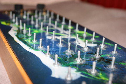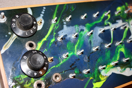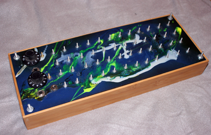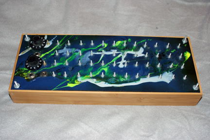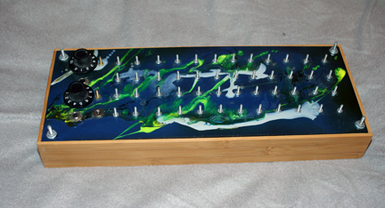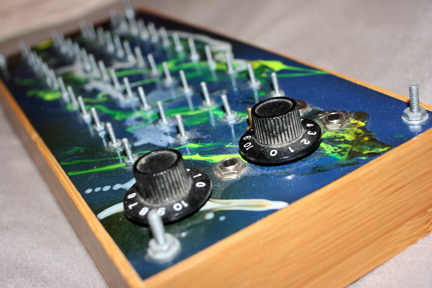 In August 2008, a year after leaving the bay for Colorado, we returned and Pau enrolled at SFAI, while I was left to reassemble my life from storage, find a job and do what I can to stay afloat financially as the economy plunged into a nosedive that effectively nixed most creative sound-folks out of gainful employment for the foreseeable future. And as we plunged, I soldered, producing an additional ten or so synths and other devices, investing what little I could into components that I dutifully plugged into a single, lonely sheet of plexiglass propped up in the corner of my office. A year later, gainfully employed, but strapped for time and energy, the sheet was almost complete, with only a few lonely components left to assemble. I’d just finished my run of Number 12‘s and had fallen pretty hard for the design aesthetics afforded by bamboo cutlery trays. Realizing that the largest trays were about half the size of my sheet of components and similar in dimensions to wedges of a Buchla boat, I impulsively hacked a year’s worth of labor in half, and began drilling a template that would accommodate my creation. And by mid-February 2010, Number 16, consisting of 48 patch points controlling 12 oscillators and two filters was ready for deployment and integration, not to mention the inevitable addition of two other similar-sized additions to complement this box in pure boat-fashion.