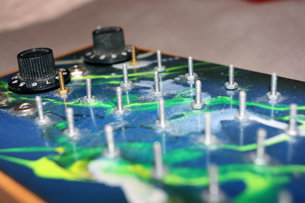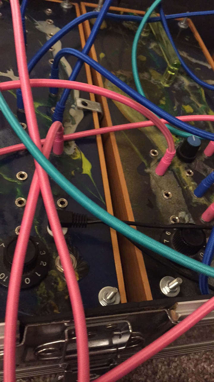 An update to the story, if you will. Starting in the spring of 2016, semi-rabidly pursuing the Eurorack bug, I decided that a good portion of the surviving early instruments in m collection needed to have a standard format, effectively creating a meta-instrument of sorts that would allow me to safely perform on these guys without worrying about a certain toddler scooting around the house at the time putting her eye out on a machine screw, as well as curtail my spending on synthesizer modules since let’s face it – I already had a bunch of stuff that I’d built over the course of a decade that was being largely under-utilized. That in mind, the machine screws were removed and replaced with 1/8″ jacks. this particular number was admittedly a bit of a challenge. First off, there were 50 jacks that all needed to be wired and grounded. Then it was a matter of having enough sheer physical space in the box to fit everything – especially since this was an issue from the beginning. I somehow managed to get away with using only 4 screws to anchor this guy’s faceplate down and there was always a bulge and bowing due to the sheer amount of wires in the box. To rectify this, I attempted to use right angle brackets to hold the case together similar to Number 11 but the bamboo was a little rigid, the screws were too big and I stupidly thought I didn’t have to drill pilot holes. Long story short, there were some failures in structural integrity. Nothing too horrible, but enough to make me question the future of this instrument as a tour boat. It actually did fine once it was mounted in the giant flight case I started using to travel with these guys – and call it a LILO approach, was one of the last boxes retired from touring.