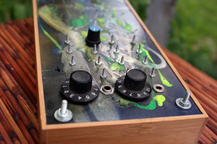 Number 20 is a bit of a remix of sorts, if you don’t mind me borrowing some jargon from our disc jockey brethren. Remember Number 8? Well, this is what it looks like now, paired with an additional filter. I (re)-built this in January 2011 in preparation for a west coast tour I was going on with Liz Meredith. I was already set to bring Number 16, as well as my Doepfer Dark Energy and figured I had the time – I was already set on moving to Costa Rica, so I nixed most major projects that I was involved with in San Francisco and had a free minute or eight in the home stretch – so why not go for consistency. Not to mention that shiny, silver enamel paint tarnishes over time, and hey, if you’re rocking your own wares, you might as well look spiffy, yeah? As you can tell from the pictures, my fine motor control is a bit lacking – well, that and all holes were done by Dremel – I really should have picked up a drill press waaay earlier – you’d be surprised the difference it makes – but hey, the painting’s cool, right?